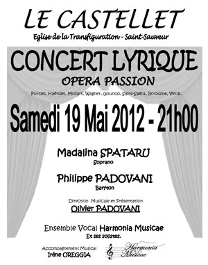 Tous ces grands airs seront interprétés par Madalina Spataru (soprano), Philippe Padovani (baryton), l'Ensemble Vocal Harmonia Musicae et ses Solistes, accompagnés au piano par Irène Oreggia et présentés et dirigés par Olivier Padovani.