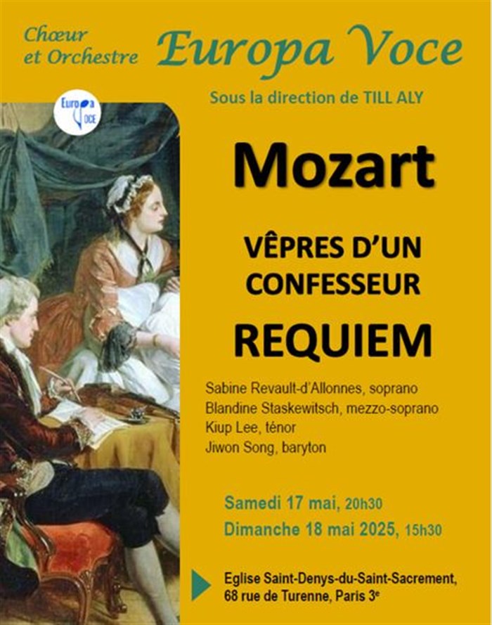 Concert donné par le choeur Europa Voce dirigé par Till Aly. L'Ave Verum corpus, les Vêpres solennelles d'un confesseur et le fameux Requiem.
