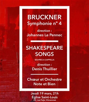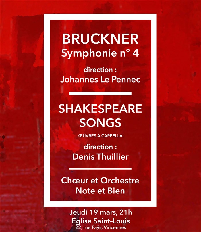 Programme russe : Shakespeare songs a cappella et la 4e symphonie (" Romantique ") de Anton Bruckner, sous les directions de Denis Thuillier et Johannes Le Pennec.