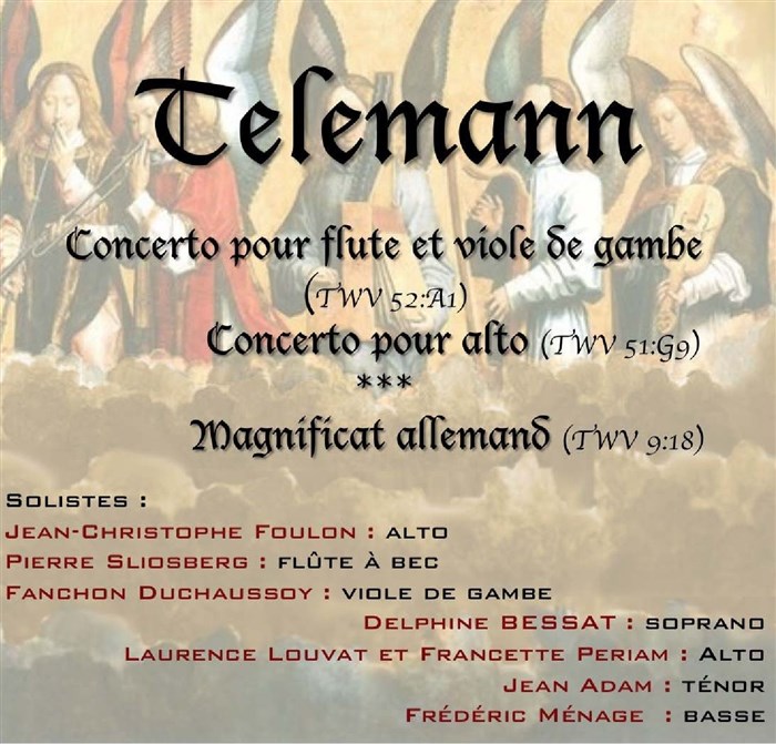Concert autour d'un des plus grands compositeurs baroque, Georg Philipp Telemann. Avec notamment son Magnificat et son célèbre concerto pour alto.