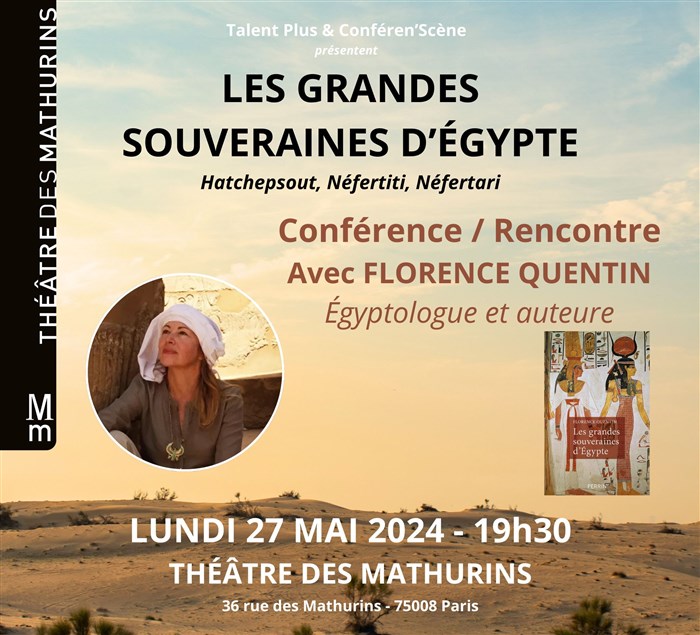 Lors de cette conférence, l'égyptologue Florence Quentin, à la lueur des dernières découvertes sur le sujet, dressera les portraits des plus prestigieuses d'entre elles qui vécurent à l'apogée de l'Égypte ancienne : le Nouvel Empire (vers 1550 et 1069 avant notre ère). Elle rendra hommage à Cléopâtre VII, leur digne héritière macédonienne.