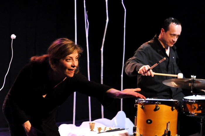 Des buissons glacés, une comédienne, un percussionniste... La neige crisse sous les pas, le vent glacé souffle, une mère s'égare dans la tempête de neige...