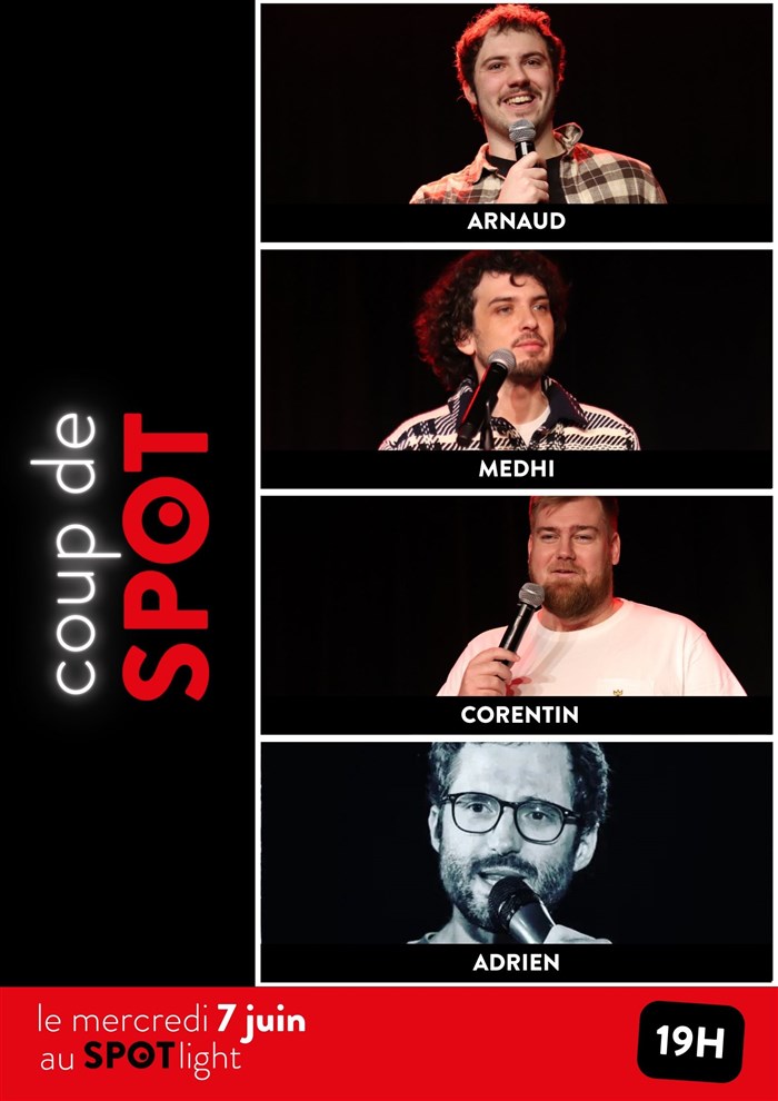L’événement Coup de Spot : Arnaud, Medhi, Corentin et Adrien de type Plateau d'humoristes, organisé ici : Spotlight - Lille, n'est plus disponible à la vente.