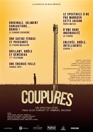 Coupures est une comédie satirique qui aborde la place que le public occupe, ou plutôt celle qu'il n'occupe pas, dans le débat démocratique. Si vous voulez que votre voix compte, levez-vous, et rendez-vous à l'Espace des Arts !