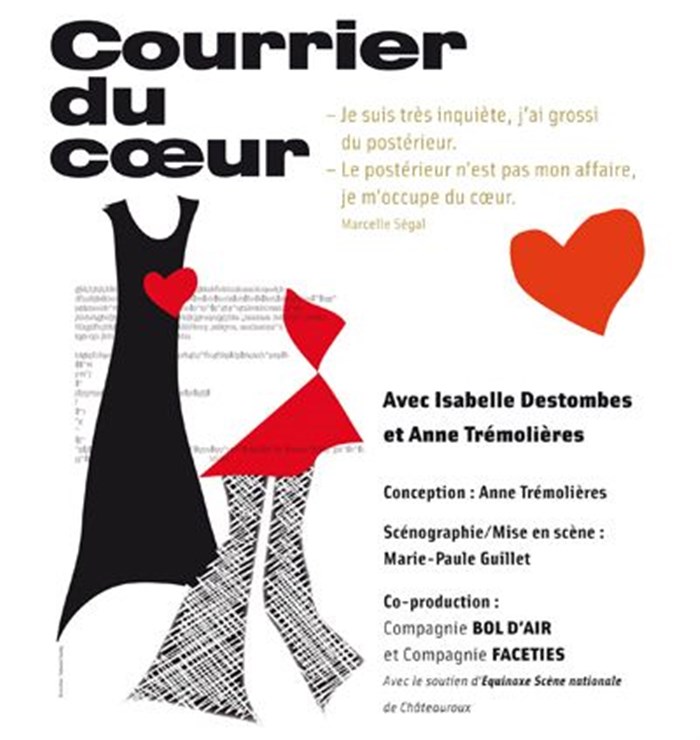mais femme jusqu'au bout...un p'tit coup dans l'rétro(années 5O)...et la ce n'est plus la même chanson!Un spectacle délicieux,intelligent, fort judicieusement construit(mis en scène comprise),ponctué de chansons de circonstance, voyez un peu(p'tit bonhomme d'Anne Sylvestre,Guy Beart,Aznavour,texte de mon cher Alfred M...,JJ Demy...Eh oui les deux excellentes comédiennes(dont l'une a une voix superbe) ne font rien à moitié!Le manifeste de la bonne épouse..Un "régal" et si vous en doutiez cela n'est pas une blague,pauvres de nous!Vous avez aussi les pubs de ces années la...un pur bonheur .Un duo de choc et de charme qui nous enchantent.Un petit bijou vraiment.C'est engagé, intelligent,instructif, documenté et orchestré avec beaucoup de talent et de finesse de jeu par deux Artistesfranchement formidables qui nous emportent dans un étonnant voyage au coeur de l'Homme,celui qui savait parler à l'oreille des Femmes!Après "irresistible" avec la merveilleuse Eva Darlan,ce "courrier du coeur"est le complément indispensable, salutaire qui conviendra à toutes et à tous sans condition!Bravo encore aux deux comédiennes et merci pour ce spectacle réjouissant!