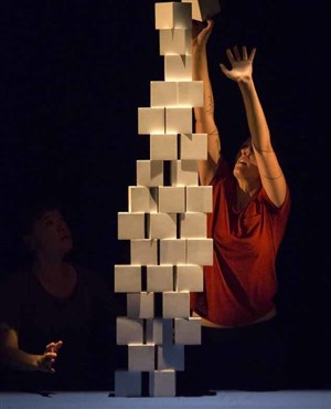 Deux joueuses manipulent ces formes géométriques, les empilent, construisent des tours, des escaliers, des façades. Elles font et défont un puzzle infini en trois dimensions et jouent avec les pixels comme on joue avec les mots. Nul besoin d'effets spéciaux, notre imaginaire est déjà en marche.
