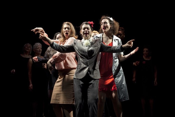 Cut est écrit comme une chanson, avec des solos, des duos, des trios, et un choeur de femmes qui tantôt accompagne, tantôt juge, condamne ou se fait l'écho de la parole donnée. Incisive, tendre et corrosive, cette pièce contemporaine joue avec les contradictions : on oscille entre le poétique et le trivial, le social et le sauvage, le tendre et le violent, le tragique et le comique.