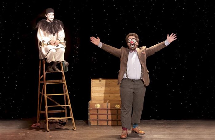 La pièce commence simplement dans un espace restreint, confiné, jonché sous les accessoires de cirque et de théâtre, comme un vieux grenier.