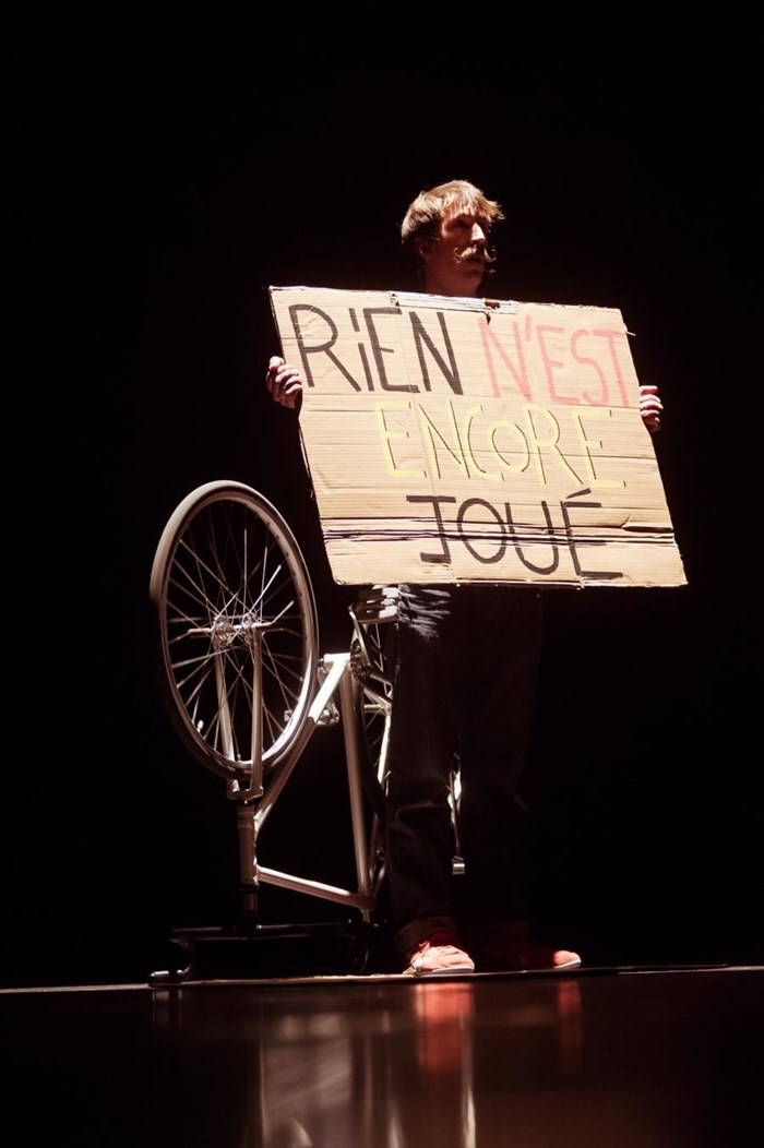 D'un côté, un duo sur vélo acrobatique le temps d'une discussion de haut vol. De l'autre, une danseuse et un acrobate, pour rendre hommage.