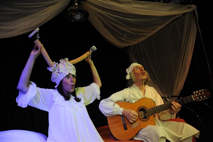 Seulement Doudou fait le malin : tour à tour chanteuse ou guitariste, il change de visage, se démultiplie, traverse le miroir, imite Bébé, fait le clown...