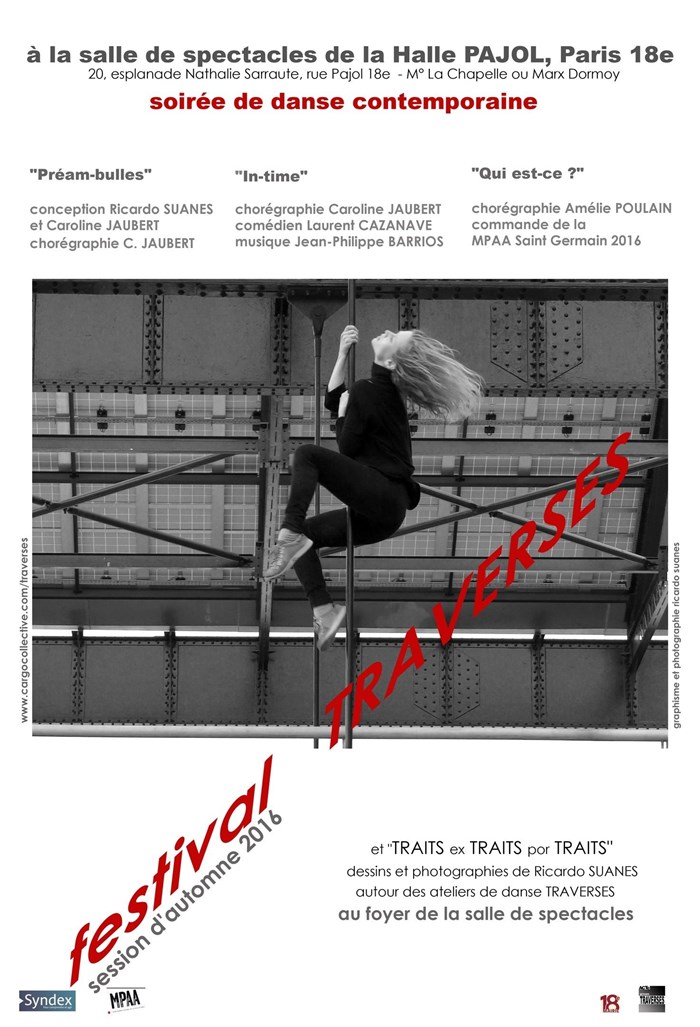 Le festival "Traverses", à sa 4e année d'existence, présente à la salle de la Halle Pajol une soirée de 3 spectacles au même temps qu'une exposition de dessins et de photographies sur la danse en lien avec eux dans le foyer de la salle.