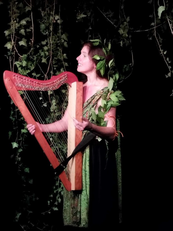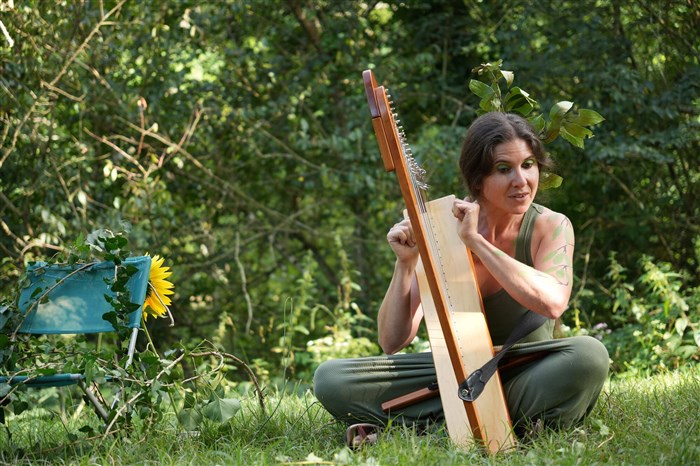 Une femme, créature des bois ?, divinité ? découvre une harpe, autrefois arbre, puis, vous conte le mythe de la nymphe grecque Daphné et du poète Orphée.