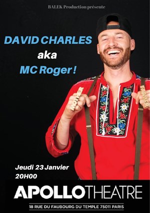 David Charles est un humoriste / chanteur / danseur. Il commence sa carrière dans les comédies musicales en Europe, notamment "Les Dix Commandements". Il signe ensuite chez Universal Swiss et sort 3 albums. En 2010, il se lance dans le One man show, puis en 2017 il crée le buzz avec le personnage de MC Rogers, un paysan des montagnes complètement déjanté ! Il fait plusieurs parodies comme "Racler comme jamais" ou "C'est l'apéro". il comptabilise plus de 50 millions de vues sur le net. Son spectacle est unique en son genre mélangeant le stand up, le chant et la danse.