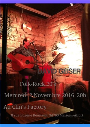 David Geiser présente en solo ses compositions, aux couleurs 60's & 70's tantôt rock crunchy tantôt folk intimistes, qui nous transportent dans une sorte de road movie imaginaire, mi-réel, mi-fantasmé, "going to the west"...