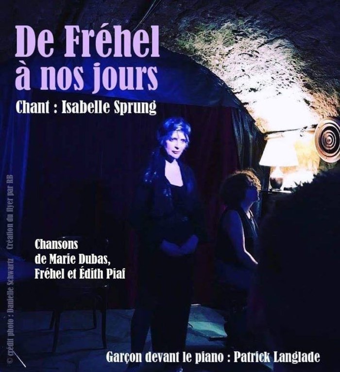 Isabelle Sprung conteuse, chanteuse, accompagnée de son pianiste Patrick Langlade, nous font découvrir l'univers de Fréhel, ses chansons, sa vie, la vie des chansons et des chanteuses qui ont côtoyées Fréhel dont Marie Dubas, dont c'est aussi le 50e anniversaire de sa disparition cette année. Isabelle nous plonge dans Fréhel vue, raconté et chanté par le biais de son regard poétique. Drôle et émouvant le piano et la voix vous enchanteront pour ce doux voyage.