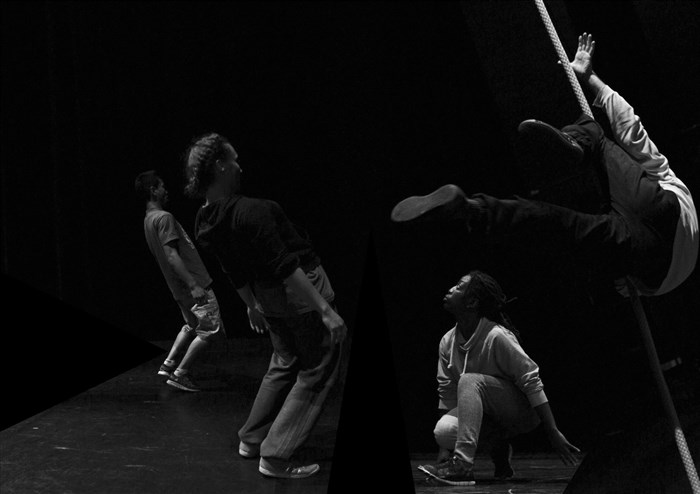 Quand hip-hop et cirque se rencontrent... De l'autre côté est un voyage qui déboussole, un bol d'air la tête en bas pour un vertige terre-à-terre.