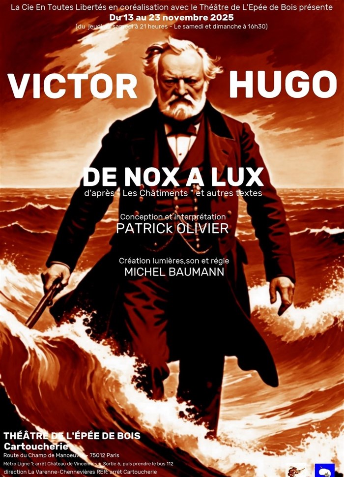 De Nox A Lux d'après Les Châtiments et autres textes de Victor Hugo est le troisième volet d'un triptyque mémoriel composé de "Personne ne m'aurait cru, alors je me suis tu / Sam Braun" et de "Witold Pilecki – Déporté volontaire à Auschwitz" (créés et joués au Théâtre de L'Épée de Bois- Tournée en régions et Belgique).
