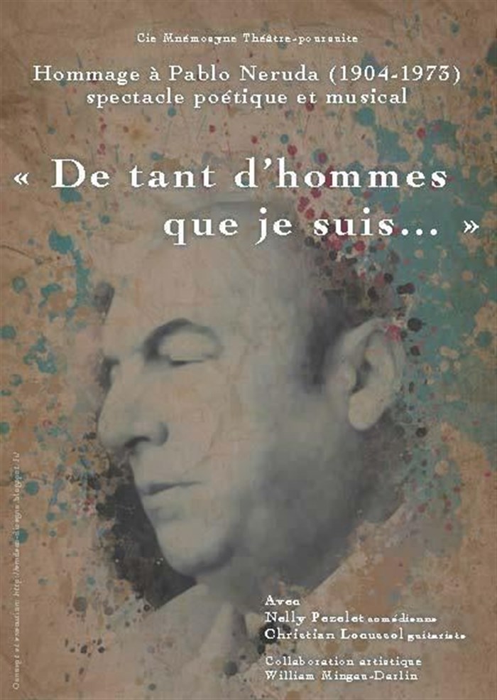 " De tant d'hommes que je suis..." est un " récital théâtralisé " où l'oeuvre et la vie de Pablo Neruda se sur-impriment, où poèmes et musiques parfois se chevauchant vous invitent à cheminer sur " les terres sensibles " du poète.