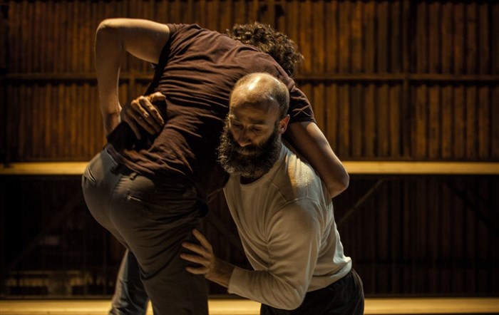 Les deux circassiens-danseurs Jean-Baptiste André et Dimitri Jourde s'en sont emparés pour imaginer un duo tout en échanges, en jeux d'équilibre de forces, en mouvements croisés, en contacts engagés...