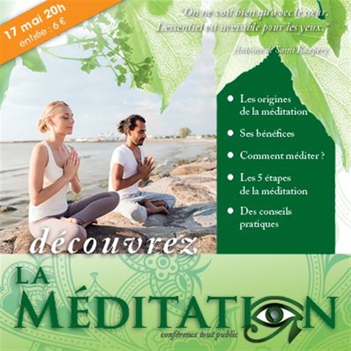 Lors de cette conférence, nous traiterons des origines de la méditation, de ses bienfaits physiques et psychologiques, et nous verrons comment l'utiliser pour l'étude de soi, et améliorer notre bien-être. De nombreux conseils simples et pratiques à mettre en application chez soi ou en groupe seront bien sûr donnés.