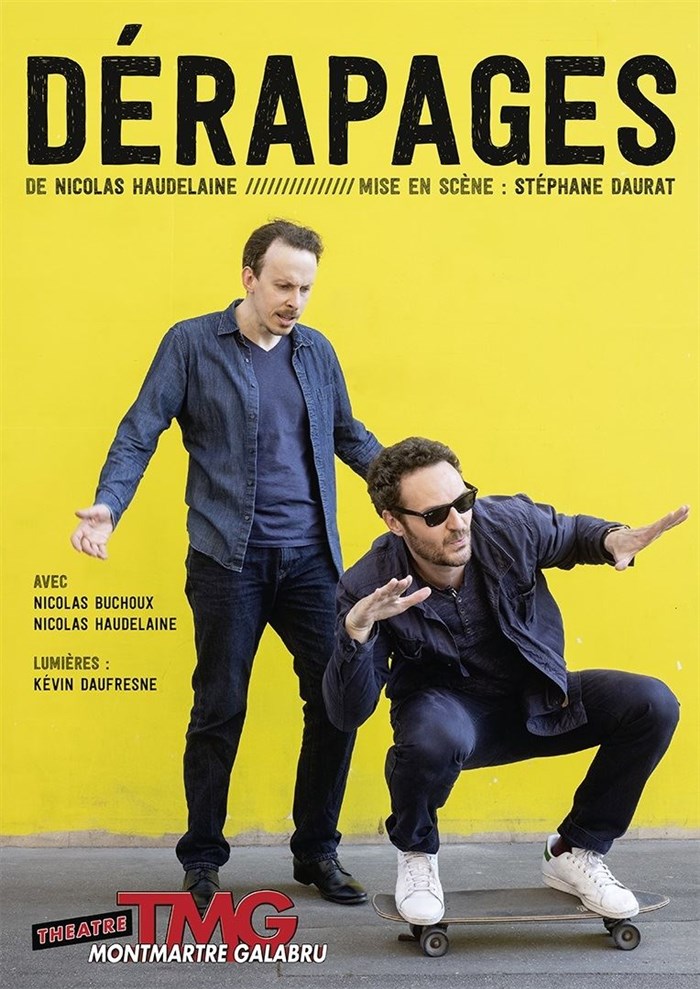 Dérapages c'est : une chaise qui rend fou, une répétition d'aérobic de trop, une psychanalyse un peu spéciale, un acte théâtral politique , un régisseur à côté de la plaque, un vendeur au bout du rouleau et un homme qui aime les poupées.