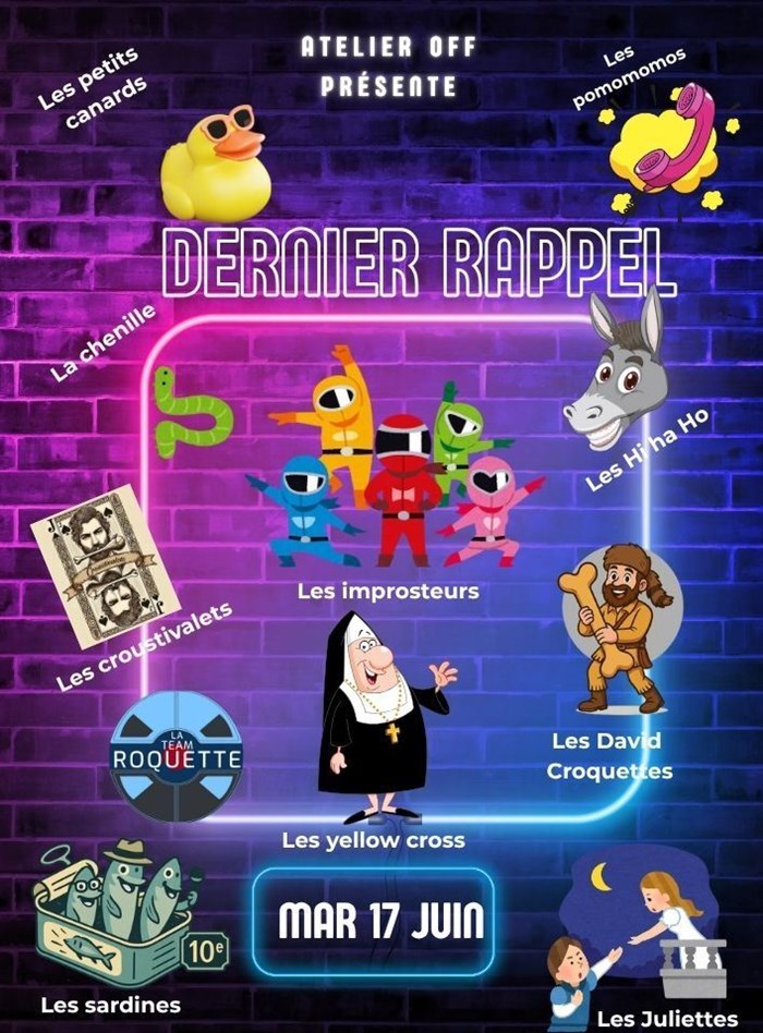 Cette année, ils ont tout donné. Ils ont crié, chanté, pleuré (de rire), chuté, brillé, et surtout... improvisé ! Pour célébrer une saison riche en énergie, en passion et en folie créative, rejoignez-nous pour une soirée cabaret unique dédiée à toutes les troupes qui ont illuminé notre scène.