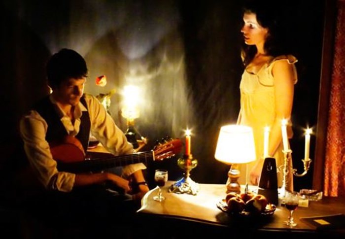 Ils s'adressent l'un à l'autre mais n'entrent en communication qu'à travers leur propre univers : lui avec ses notes, elle avec ses mots. La nuit qui vient apporte avec elle réminiscences et doutes. Le temps qui passe s'incarne dans le rythme de la guitare et des mots.