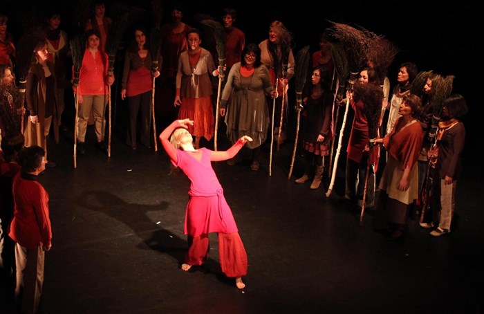 Ici, pas question de raconter une histoire, ni de traduire un poème. Mais simplement de mettre en présence et en lumière la puissance d'une communauté de femmes réunies par la musique des mots, le rythme des corps et ainsi retracer leur histoire par delà les frontières : rêve de jeunesse, conscience des réalités douloureuses, colères et insoumissions, voie du détachement...