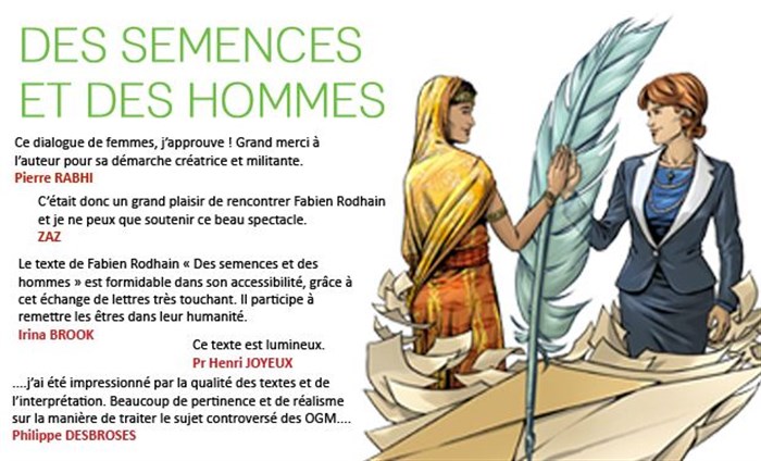 Cette pièce est originale, alliant le style épistolaire, l'engagement politico humanitaire, et l'empathie entre 2 femmes. C'est très bien mené, et les 2 comédiennes sont dignes de l'enjeu. Le spectacle permet de (re)prendre conscience de la catastrophe des OGM, et des enjeux financiers au dessus de toute autre considération. On voit trop peu de pièce de ce type, la petite salle du Nord-Ouest mérite de se remplir... La fin est plutôt surprenante, traité peut-être de façon un peu expéditive. En l'état, c'est court et dense, plein d'humanité, entre 2 femmes que tout oppose, avec une occidentale parfois un peu décalée et naïve, tellement loin des enjeux en Inde.