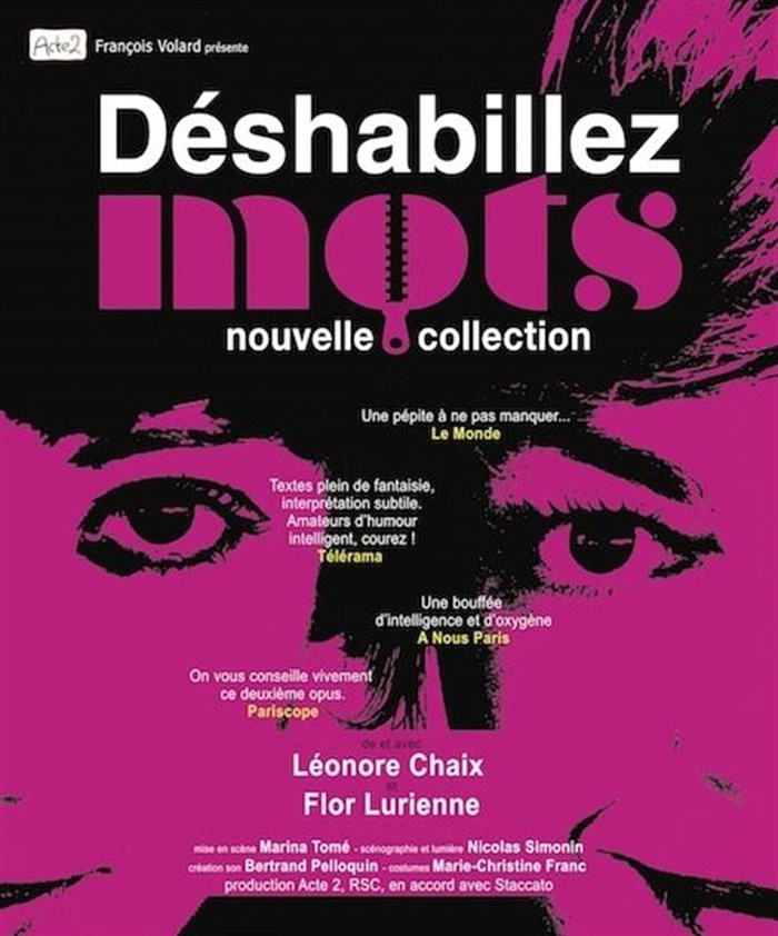 Et comme le plaisir est intact et le succès toujours au rendez-vous, Flor et Léonore écrivent " Déshabillez mots, Nouvelle collection " opus tout aussi réjouissant et foldingue que les premiers. A nouveau, elles s'amusent avec les mots, les transforment en personnages pour leur donner vie. Une écriture brillante et ciselée qui emmène avec bonheur le public dans les subtilités du langage. Il y a du Raymond Devos et du Raymond Queneau dans la plume et le brin de folie de Flor et Léonore. Ce déshabillage métaphorique et poétique des mots est une vraie pépite.