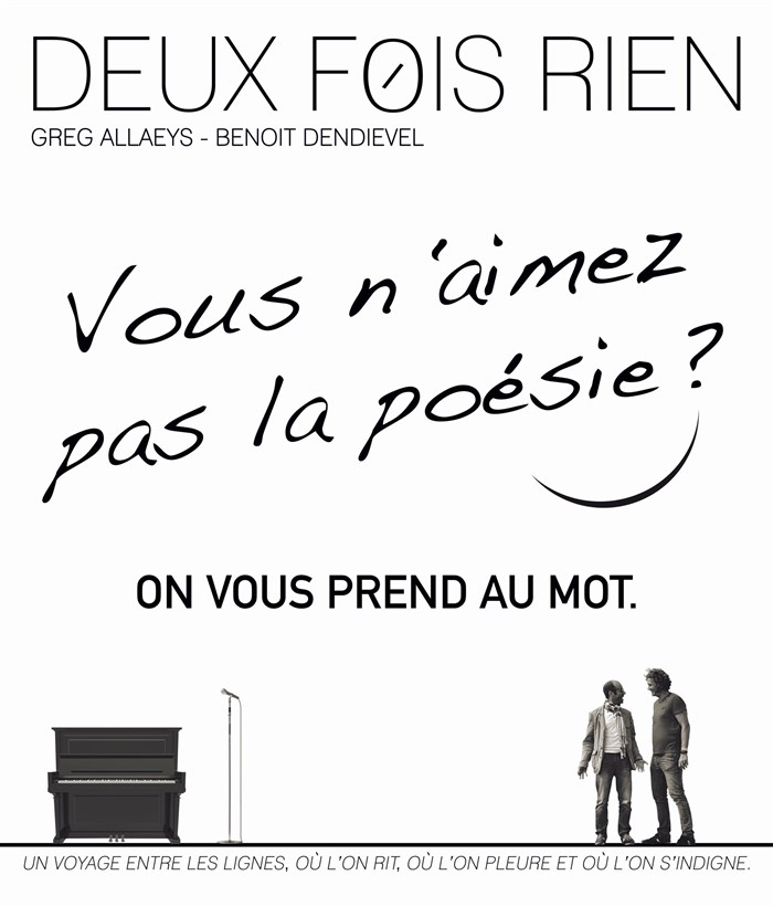 Un spectacle qui sort des entiers battus avec de la poésie, des bons sentiments, des bons mots, des jeux de mots, de l'humour, de la musique... Un pianiste épatant et un comédien exceptionnel qui forment un duo des plus sympathiques :) J'adore ! Déjà vu 4 fois !