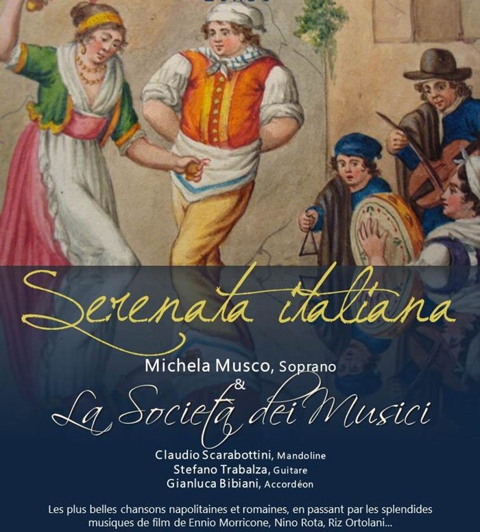 Chansons napolitaines & romaines mais aussi airs d'opéra et musiques de films interprètées par Michela Musco, soprano, accompagnée par La Sociétà dei Musici - guitare, mandoline et accordéon - formation musicale en provenance d'Italie.