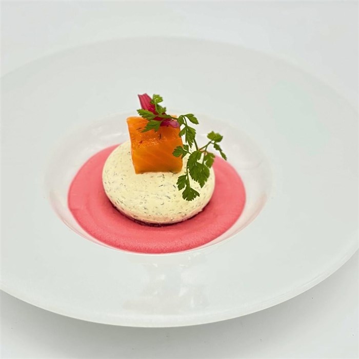 L'entrée : Le Bavarois de courges aux épices cajun, Pickles de Fenouil, carotte jaunes, Saumon Gravelax à l'aneth