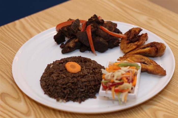 Tasso de cabri (avec riz djondjon, bananes pesées et pikliz)