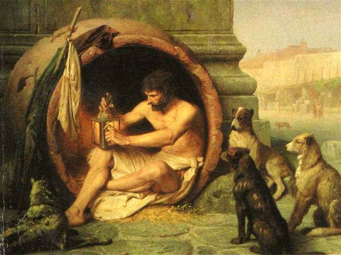 Philosophe en actes et non seulement en paroles, Diogène prône la défense de la Nature et interroge les comportements des humains en Société.