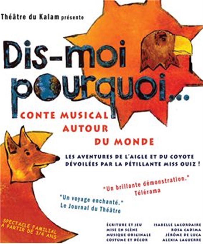 Magnifique spectacle plein de poésie et d'énergie. Miss Ouiz nous entraine dans son aventure avec ses amis l'aigle, le coyotte, la grenouille et bien d'autres ....Les petits (5 ans) comme les grands (10 ans) ont adoré.