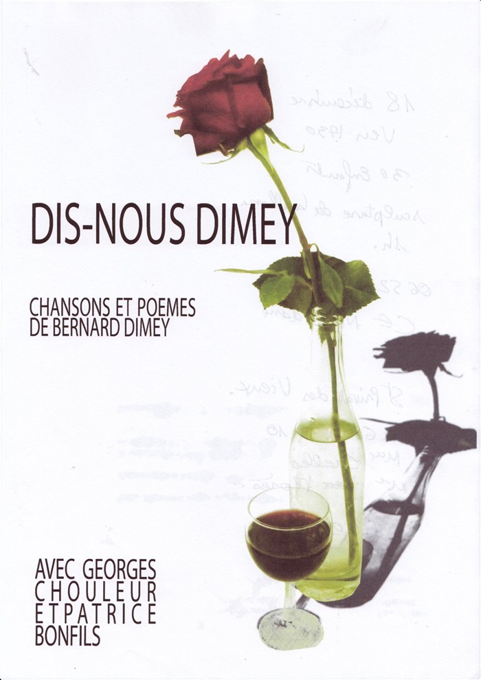 Bernard Dimey nous a quitté en 1981, dans l'indifférence presque générale. Avec ce Dis nous Dimey, Patrick Bonfils (guitare, banjo et voix) et Georges Choufleur (harmonica et voix) n'ont d'autre ambition que de tenter de rappeler cet immense poète à notre souvenir.
