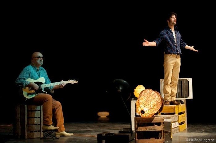 Le guitariste Carmelo Prestigiacomo, sur une scène jonchée de caisses, accompagne l'acteur virtuose. Conférence, expérience sidérante, bombe ou performance, on assiste à une leçon de géo-sociopolitique depuis le point de vue des puissants, des dominateurs cyniques.