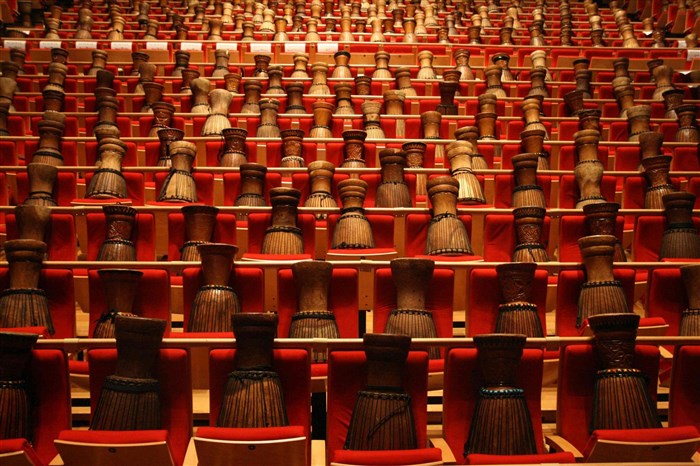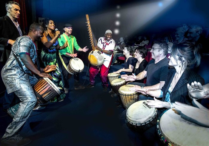 Dans la salle, sur chaque siège est posé un djembé. Sur scène, des musiciens, des chanteurs et un maître de cérémonie vous accompagnent.