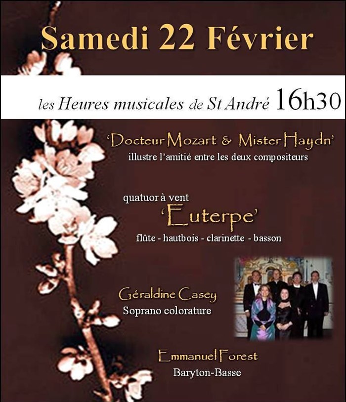 en la très épure et magnifique église st André de l Europe,j ai eu le privilège et le grand bonheur d assister à un récital d une "intelligence" rare tant musicalement(remarquable quatuor à vent) que vocalement(Emmanuel Forest, excellent baryton basse et Géraldine Casey sublime soprano coloratur).Je rends au passage hommage aux choix éclairés et remarquables, par leur qualité, à l organisateur,impliqué et passionné des récitals "musique.sacree.en.capitale@gmail.com").Les oeuvres interprétées connues ou moins, étaient préalablement introduites par des "repositionnements dans le contexte",les liens associant Mozart à Haynd,judicieusement énoncés,sans emphase avec ce qu il faut d équilibre entre la rigueur et la légèreté permettant ainsi à tous de pleinement et librement, se laisser porter par ces voix ô combien "expressives" et cette musique magnifiquement servie....Je tiens à remercier tout d abord Mozart, Haynd sans lesquels ce spectacle n aurait sans doute pas eu lieu,je réitère mes compliments à l organisateur(présent dans la salle, je salue bien bas les musiciens fabuleux et je redis tout le bien que je pense sur les deux interprètes remarquables...Si je devais décerner un "Oscar"pour ces heures exquises et musicales, les nominés seraient à n en point douter,le quatuor à vent"Euterpe",dans la catégorie des meilleurs espoirs qui n ont pas déçu nos espérances,Géraldine Casey et Emmanuel Forest..et le prix est attribué à...Amadeus Mozart pour les "Mélodies françaises et italiennes "et "les noces de figaro" et Joseph Haynd pour les mélodies écossaises et la symphonie 101"l horloge"