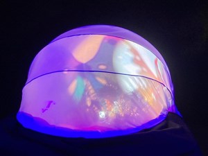 Un dôme lumineux qui, tel un manège, tourne sur lui même, et fait défiler des rêves : paysages, animaux, océans et jardins.
