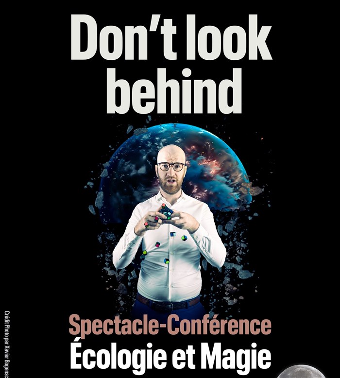 "Don't Look Behind" est un spectacle-conférence sous la forme d'un cours donné à une classe d'élèves, dans lequel l'intervenant principal est ingénieur consultant mais aussi magicien.