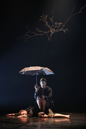 L'attente fascinante de deux clowns lunaires. Deux personnages attendent. Deux silhouettes, perdues entre deux chaises et un parapluie.