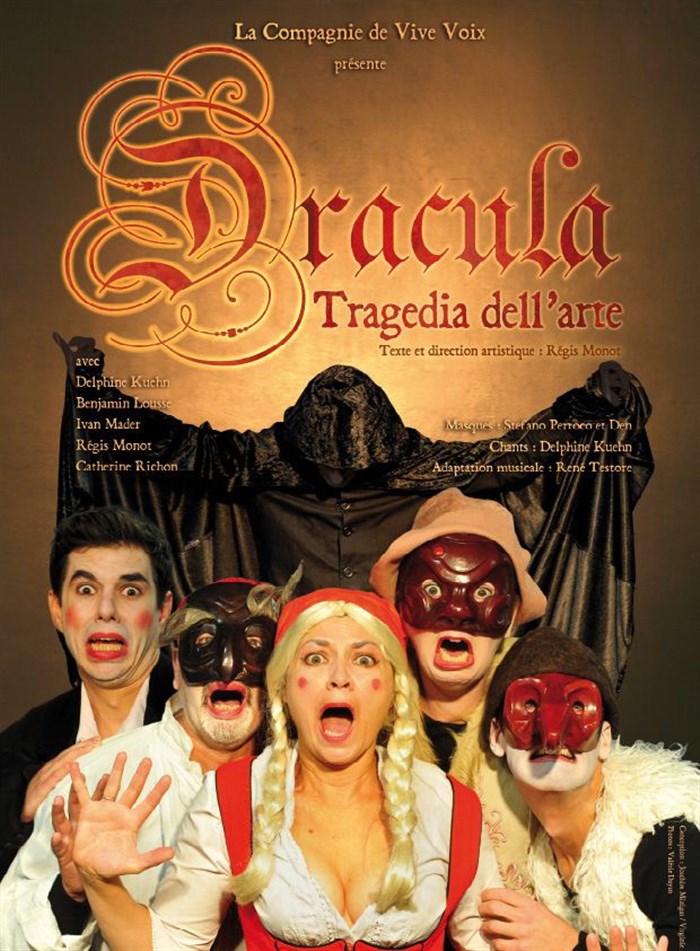 La compagnie de vive voix adapte le roman de Bram Stoker, version commedia dell'arte (masques, pantomimes, chants, combats et clins d'oeil à l'actualité. 5 comédiens jouent 11 personnages et retracent l'histoire du comte Dracula. La pièce rend aussi hommage aux oeuvres cinematographiques traitant du même thème. On pense à Nosferatu de Murnau,et de Werner Herzog, Dracula de F.F Coppola ou Le bal des vampires de Roman Polanski.