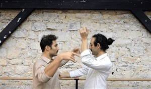 Sur scène, deux corps masculins. L'un est mince, svelte et élancé tandis que l'autre est musclé, charpenté et robuste. Tous deux sont unis par une même gestuelle composée de stéréotypes de la masculinité, signant la mise en corps virile de valeurs comme la force, la puissance et la performance.