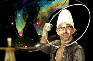 Entouré de fioles en tout genre, magicien de bulles, il passe avec habileté du texte à la danse, tutoie les gouffres, les prend de vitesse, lutte contre le temps qui lui est compté, armé de son humour qui instille de la légèreté dans la gravité et déployant des images d'une grande poésie.