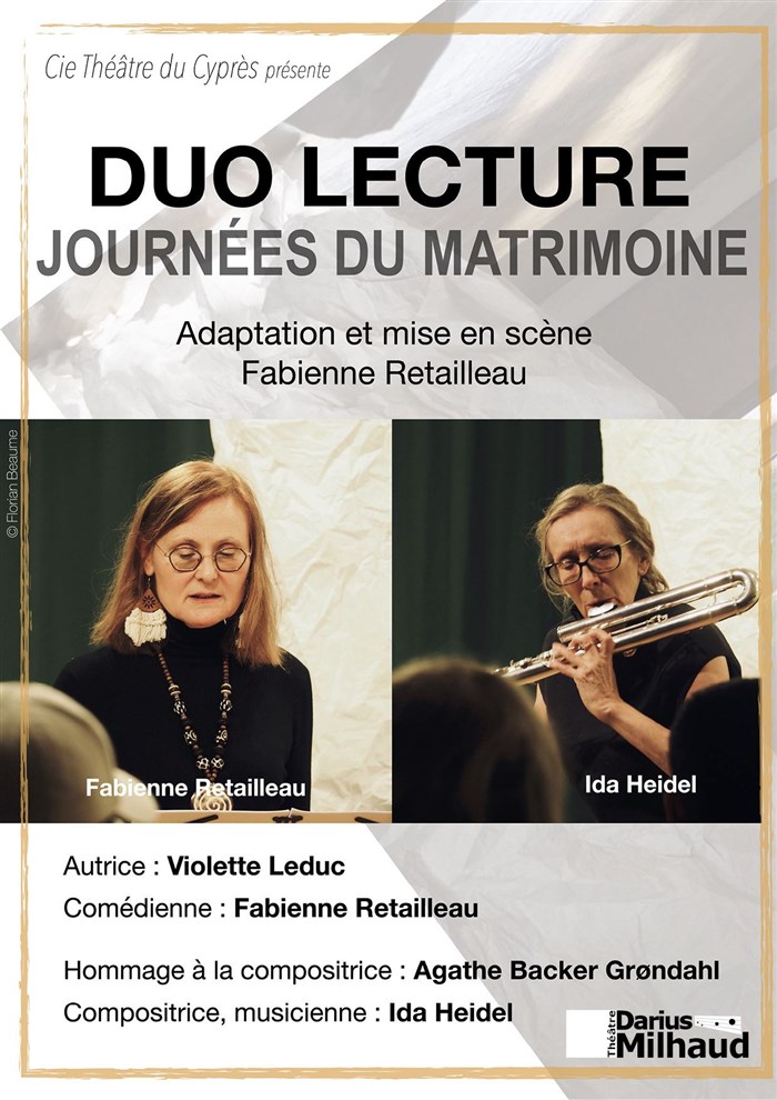 "Duo Lecture - Journées du Matrimoine" est le premier duo spectacle-lecture d'une série de six (Journée du Matrimoine en septembre, Journées Nationales de L'Architecture en octobre, Journée Internationale de lutte contre les violences faites aux Femmes en novembre, Nuits de la Lecture en janvier, Rencontre Contemporaine en février et Printemps des Poètes et Poétesses en mars).