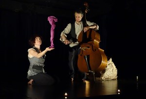 Une danseuse, un contrebassiste et du papier pour un spectacle magique.