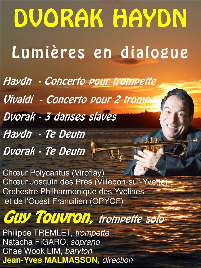 Dans une première partie instrumentale, Guy Touvron, trompette solo de renommée internationale, en qui son maître Maurice André voyait un "artiste complet, interprétera le concerto pour trompette de Haydn et celui pour 2 trompettes de Vivaldi. Il sera accompagné par l'Orchestre Philharmonique des Yvelines et de l'Ouest Francilien, qui complètera cette partie par trois danses slaves de Dvorak.