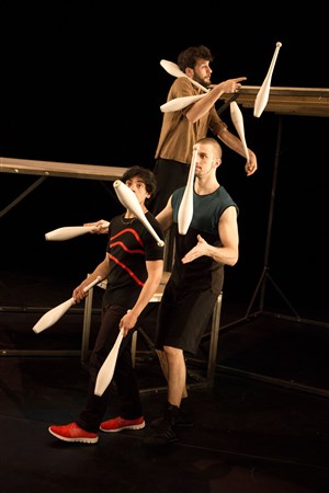 Trois jongleurs et chacun trois balles, trois anneaux et trois massues : des ingredients en nombre limité dans un espace limité, en autres mots une contrainte créatives.